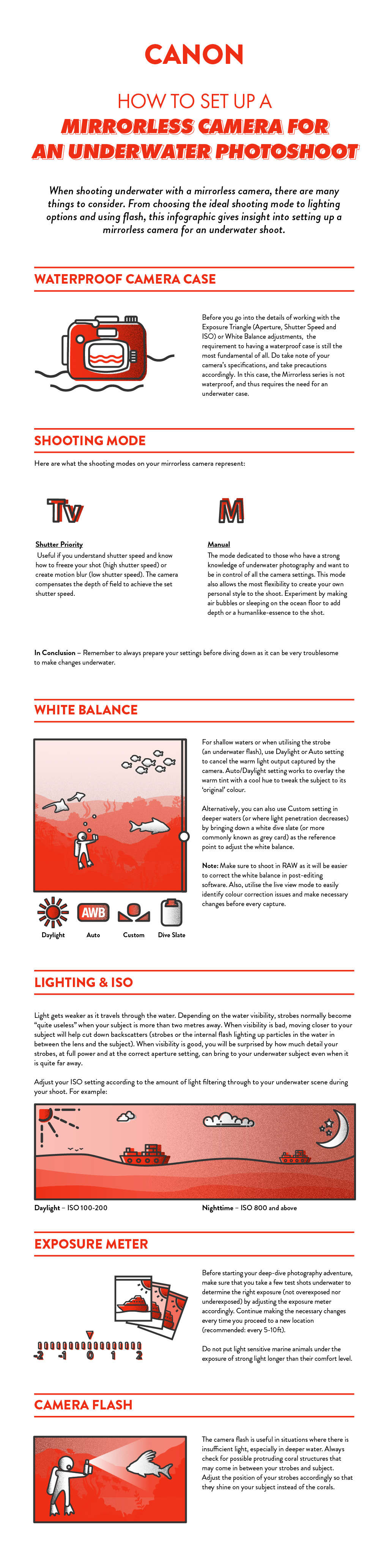 When shooting underwater with a mirrorless camera, there are many things to consider. From choosing the ideal shooting mode to lighting options and using flash, this infographic gives insight into setting up a mirrorless camera for an underwater shoot.