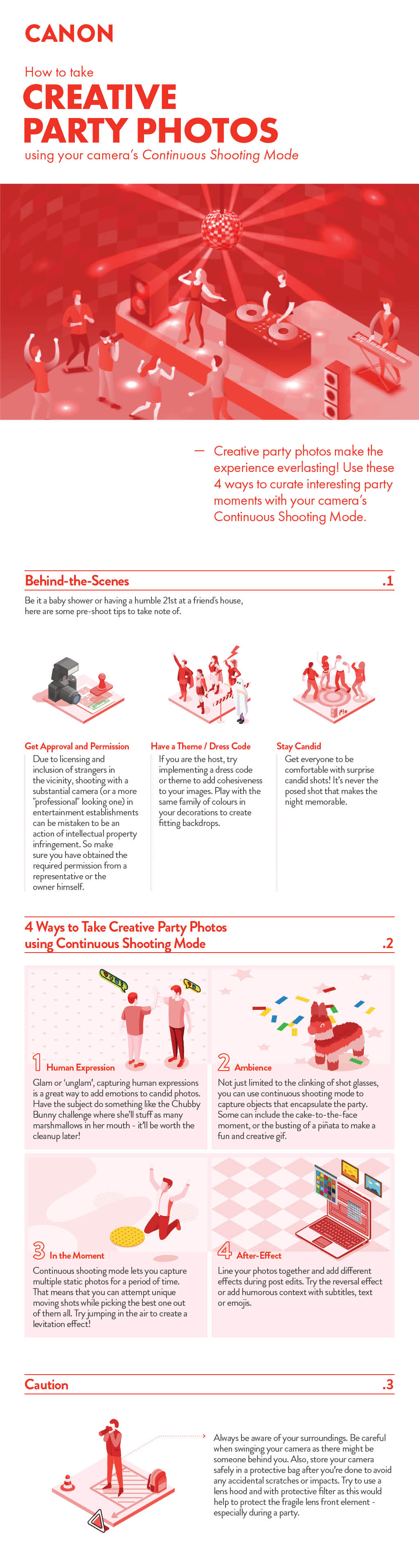 To summarise, always be sure to obtain permissions before commencing any party photoshoots, decide on a theme (if you’re the host) and get everyone comfortable with surprise candid shots. Use Continuous Shooting mode to capture human expressions (especially when one is doing a party trick) to add emotions to the image, to create gifs for the party activities like the cake-in-the-face moment, unique static movement shots that work for the levitation effect, or for post-edits to add text or emojis to the static image-created gifs!
