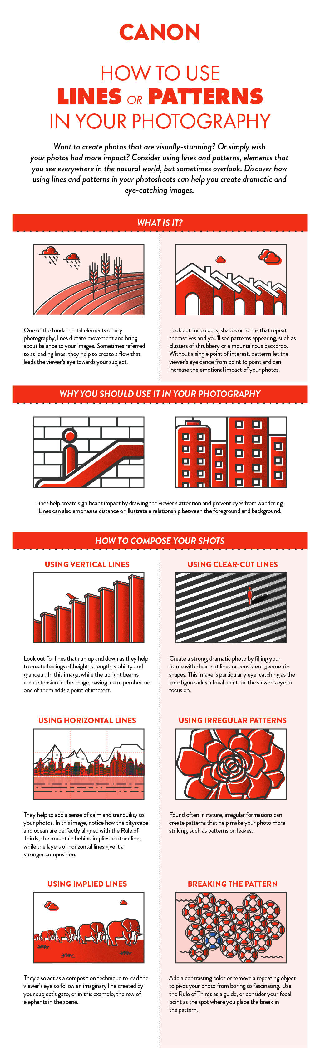 When composing your nature shots, the lines or patterns you identify can add a helpful flow or rhythm. They can even create drama and tension to give you more visually-striking photos. With this handy infographic, understand how incorporating lines or patterns in your shots of the great outdoors can help improve your photography.