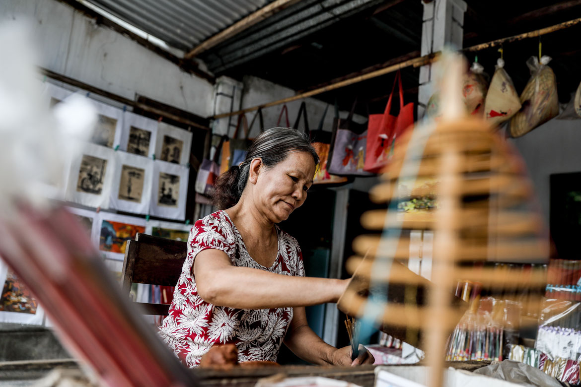 An incense stick maker hard at work – she crafts nearly 3000 sticks by hand every day.