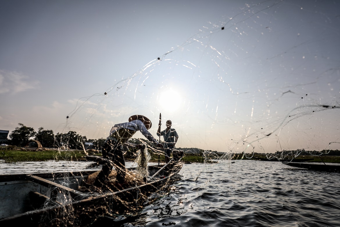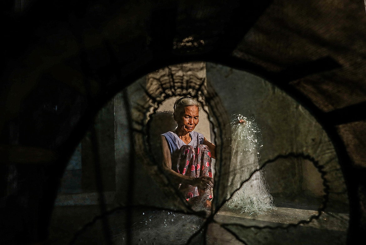 A fisherwoman mends her net in the last rays of the afternoon sun
