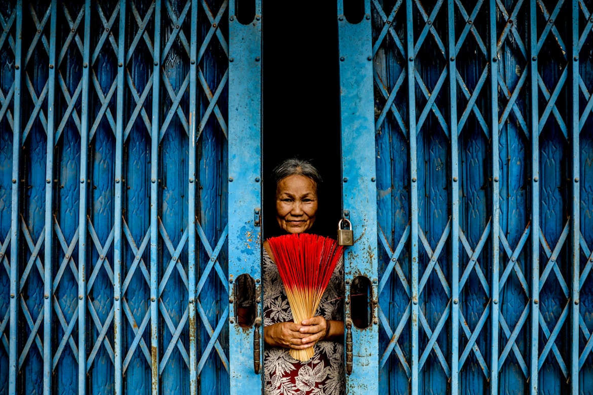 There are two ways you can go about street portraiture – staged and un-staged. With staged street portraiture, you don’t change the surroundings of the subject, but instead the subject. Give them something to hold or position them elsewhere as you feel best for your image (remember to be polite when you ask). In the case of this incense stick maker, I thought the colour of her incense sticks would really pop against the blue gate, so I guided her to stand as such.