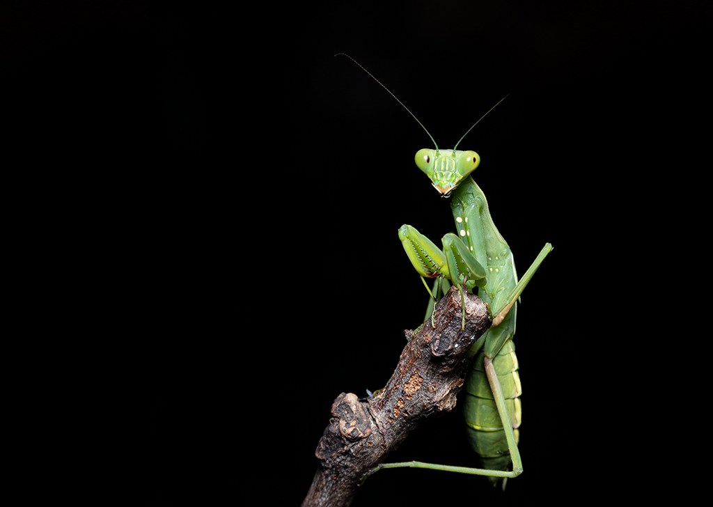 Photographer’s note: praying mantises are usually very cooperative subjects since they do not move around much nor jump very far. They are pretty easy to handle and will gladly stay perched on top of a stick until they find another platform to grab.
