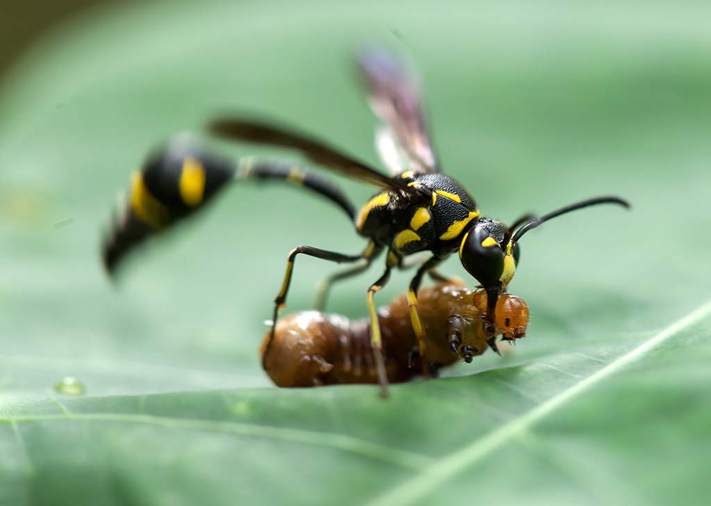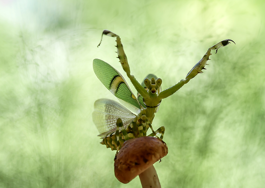 Photograph insects in action or with flattering angles through the positioning of your camera to add more interest to the shot. For example, butterflies resting with their wings open can reveal a design that is hidden when closed. Another example could be to photograph the side profile of a caterpillar to showcase its unique pattern. When spooked out, predatory insects like the praying mantis can switch to a defensive pose that can be quite charming to photograph. However, we do not recommend causing distress to the insect for a mere photo. Always respect mother nature!