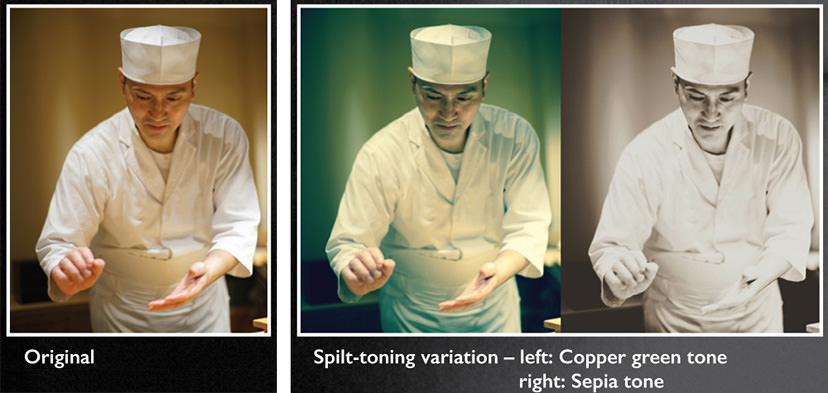 For colour prints, split-toning helps create a unique colour scheme in the final print. For example, to ‘tone’ the shadows with a green copper effect, simply click on the split-toning tab, choose shadows and move the slider to select the desired colour range. The chosen effect is rendered onscreen, making it easy to experiment with different colours. By consistently applying the split-toning effect on your portfolio of images, you can establish an identity and style of your own.