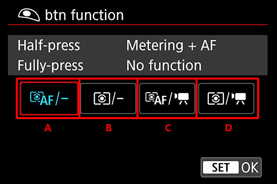 [A] Press halfway: Metering and AF start/ Press completely: No function