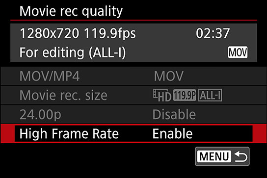 In the Movie recording quality menu, set High Frame Rate to “Enable”. Note that the movie recording size is limited to HD in this case.