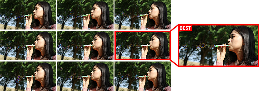 Although the resolution of the image captured via Frame Grab is lower compared to still shots, you can make use of the feature in the same way as a continuous shooting function to capture objects whose shape is changing constantly or a fleeting moment without experiencing any frame drop.