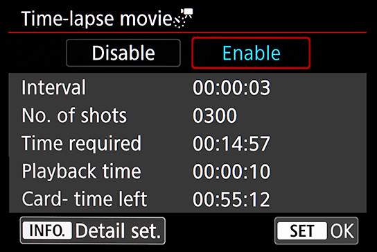 Time-lapse movie is a feature that combines still shots taken over a specific interval into continuous movements with a “fast forward” effect. While this function is available on many cameras, they mostly capture stills as continuous frames and do not allow you to view the resulting movie on the camera immediately after shooting. Meanwhile, the Time-lapse movie feature on the EOS 5D Mark IV shoots a movie by adding one frame at a time to a video file, so you can preview the movie on the camera.