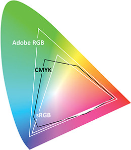 The diagram below shows the difference in the range of colours displayed by sRGB, Adobe RGB and CMYK colour space.