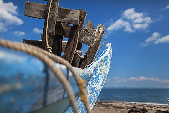 I took a shot of the boat from the side at first, but it captured the subject’s shape too accurately and failed to convey any sense of dynamism. Regardless of which wide-angle lens you choose, it is hard to create a noticeable distortion effect if you are capturing the subject directly from the front. In comparison, a composition with the bow of the boat directed toward the sea helps to add a sense of dynamism to and bring out depth in the image.