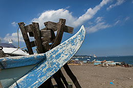 I positioned the lens as close as possible to the subject such that the bow of the boat remained visible from this sideward view. Doing so created a significant distortion effect on the boat, as if it was moving toward the sea. As illustrated here, you can play up the unique characteristics of a wide-angle lens by moving the camera close to the subject.