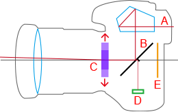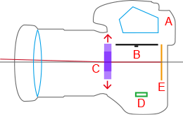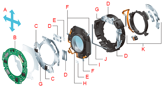 In an SLR camera, light (image) that passes through the lens is reflected from the semi-transparent main mirror, and reaches the viewfinder through the prism. The image that passes through the main mirror is reflected from the sub mirror behind before reaching the AF sensor. Upon releasing the shutter, the mirror flips up for the image to reach the image sensor. The key difference between the in-lens and the in-body IS system is that the image is corrected before it reaches the mirror.