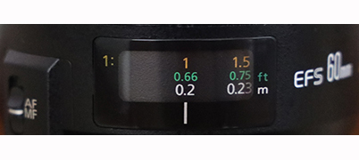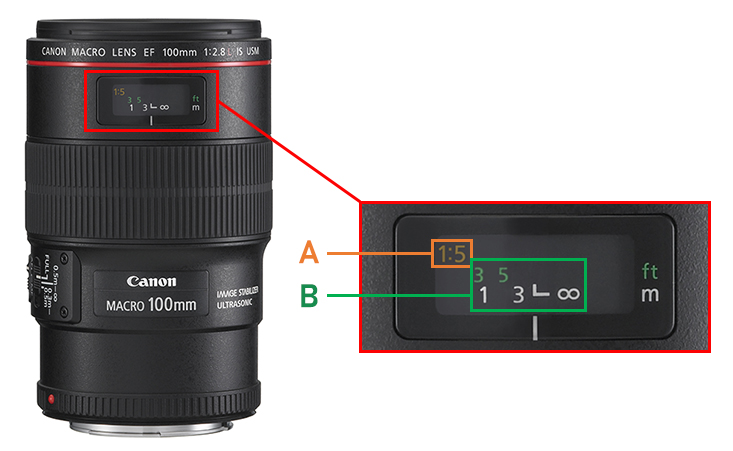 In the image above, the lens is set to focus to infinity, and the ratio in ‘A’ indicates the magnification ratio (actual size of the subject compared to its image on the image sensor). The ratio of 1:5 indicates a magnification of 0.2x.
