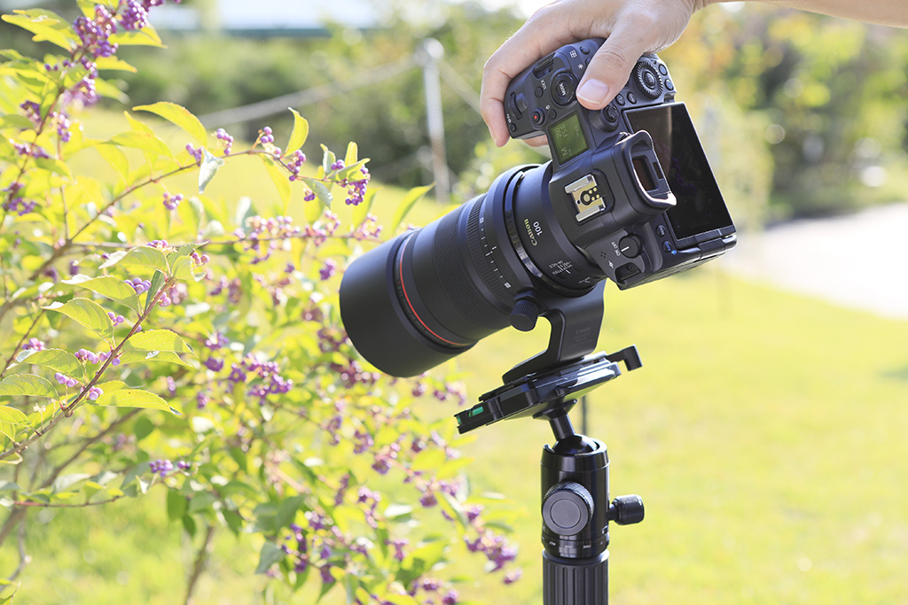 You just need to loosen the lock knob on the mount, adjust the camera and lens to your desired shooting position, and then tighten the lock knob again. While the image above shows the RF100mm f/2.8L Macro IS USM, the same applies for the tripod ring mount that comes bundled with most L-series telephoto lenses.