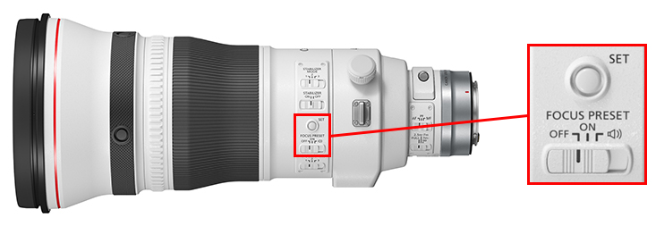 The focusing distance range selector switches on (from left) RF100mm f/2.8L Macro IS USM, RF400mm f/2.8L IS USM, and RF70-200mm f/4L IS USM.