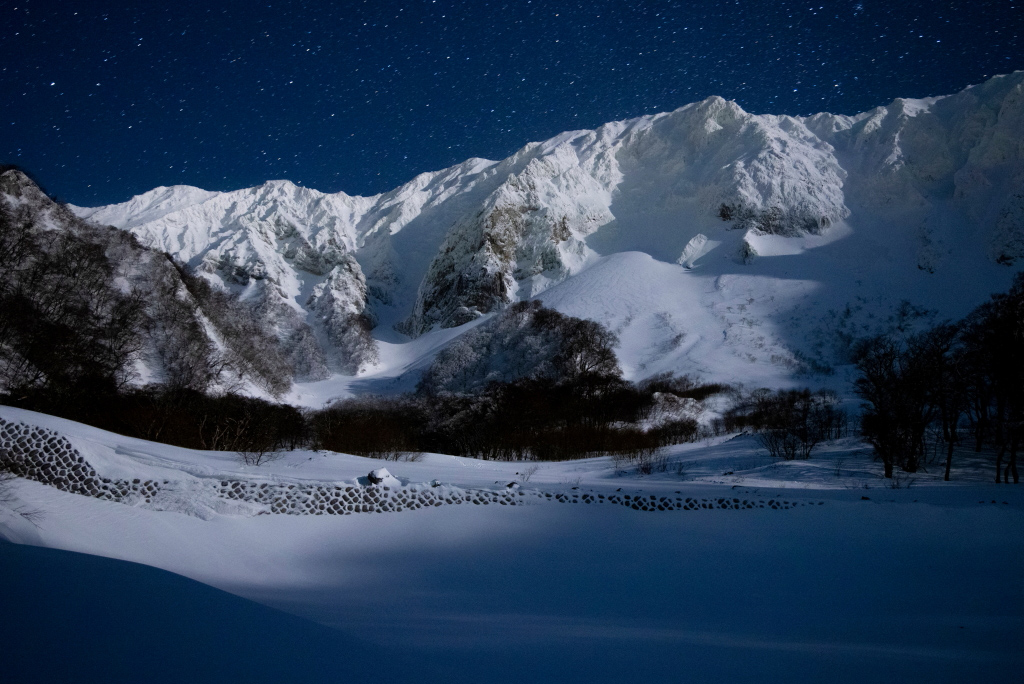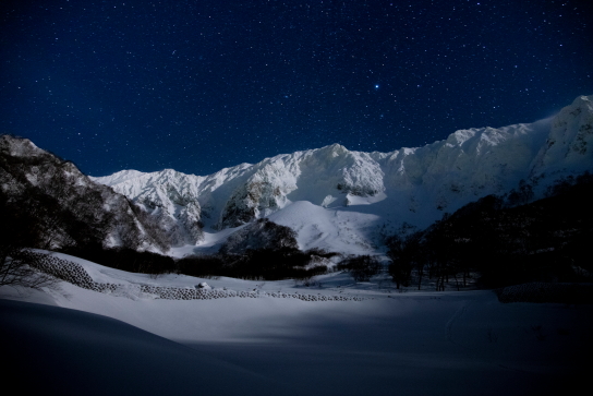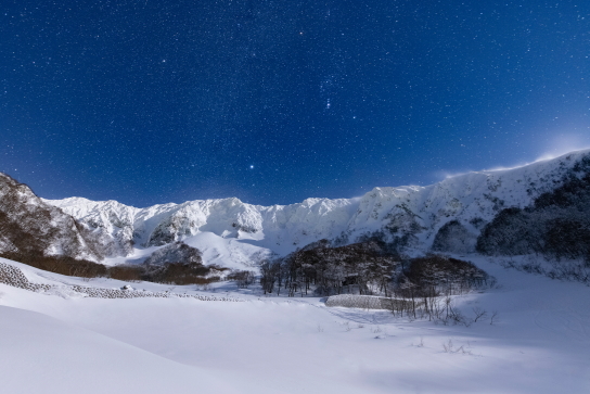 At almost 1,000m above sea level, the air surrounding the valley is usually clear in winter. As the main image shows, you can see many stars even on a moonlit night! The white, snow-covered northern face of the mountain range, however, is also an impressive sight, rising up against the darkness, lit by moonlight.