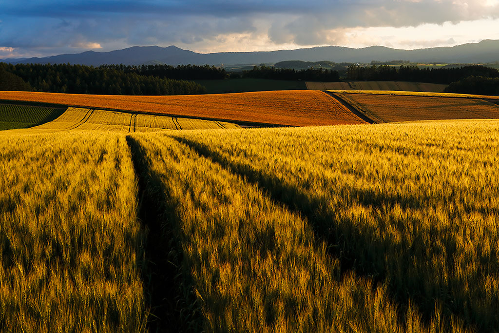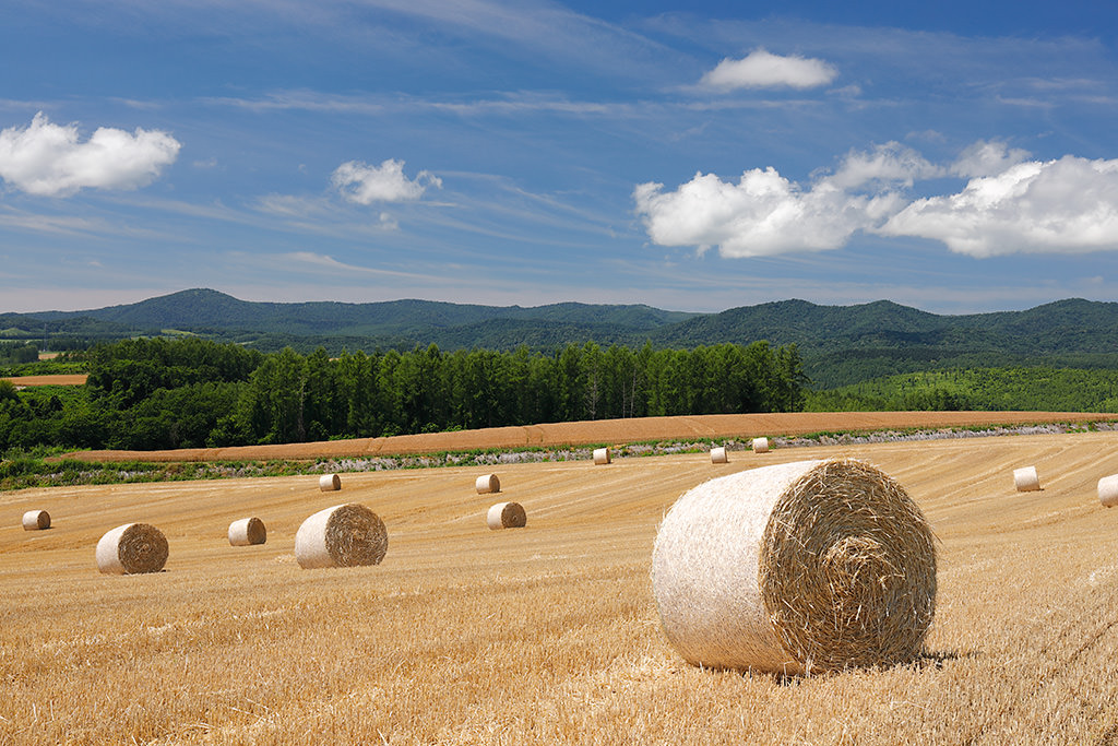 Straw rolls lying on a field – a typical sight that you would encounter in Hokkaido in summer. While the weather may be unexpectedly hot, the breeze is very refreshing indeed. A clear and vivid photo is best suited for conveying such a scene.