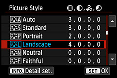 If you want to produce depictions with a deep focus at a low ISO speed and an image that is sharp up to the details, or during the darker hours of the day when the shutter speed tends to slow down, such as in the early morning or late evening, make use of a tripod and a remote control to prevent the undesirable effects of camera shake. Meanwhile, on a cloudy day when the colors are dull, selecting the "Landscape" Picture Style helps to reproduce the original colors in vivid tones.