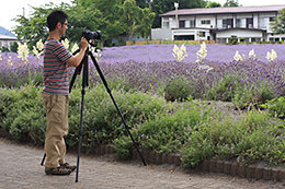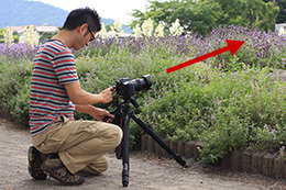 I ran into a flower carnival at the foot of Mt. Fuji. If I were to take a shot at the eye level, objects in everyday scenes, such as the transmission wires and houses, would also be captured in addition to the lavender and Mt. Fuji. This results in a photo without a well-defined theme. To prevent such unwanted objects from being included, I set the camera at a low position. While checking the image on the Vari-angle LCD monitor, I looked for a composition with the lavender as the main theme, and established focus on the flowers in the foreground using the Live View function.