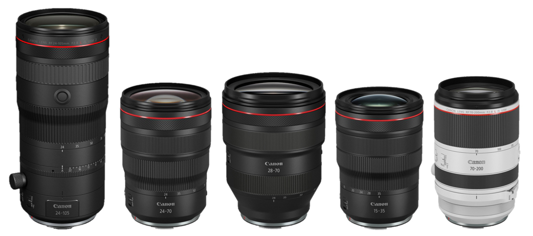The traditional holy trinity consists of the 15-35mm (wide-angle), 24-70mm (standard), and 70-200mm (telephoto). However, Canon has two more fast standard zoom lens options: the RF28-70mm f/2L USM and RF24-105mm f/2.8L IS USM Z. Choose the one that best fits your needs!
