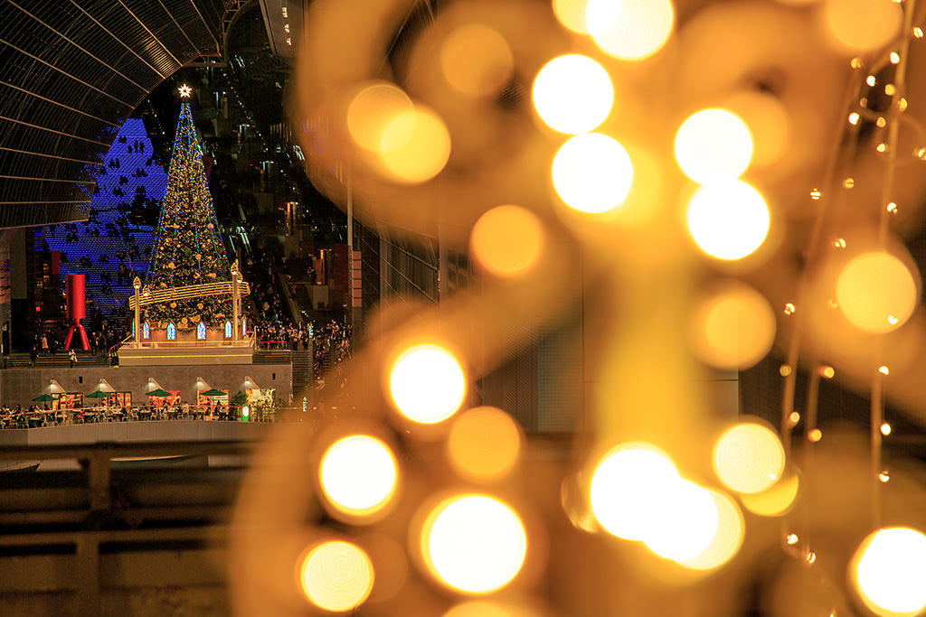 Illuminations are one of the easiest point light sources to use for creating bokeh circles. I set the aperture to f/4, came right up close to the illumination in the foreground such that it was nearly touching my lens glass, and then defocused to create large bokeh circles.