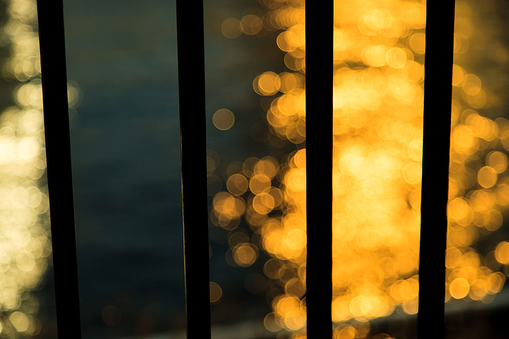 I took a shot of a sparkling river surface at sunset. I created a large blur in the background by focusing on the fence in the foreground. This resulted in a fantasy-like image of the numerous bokeh circles extending across the surface of the river.