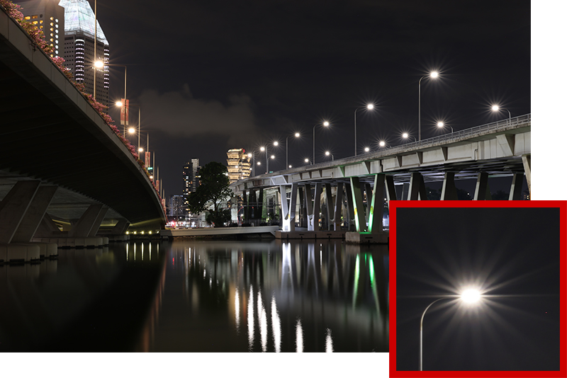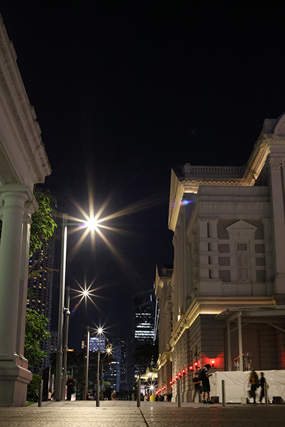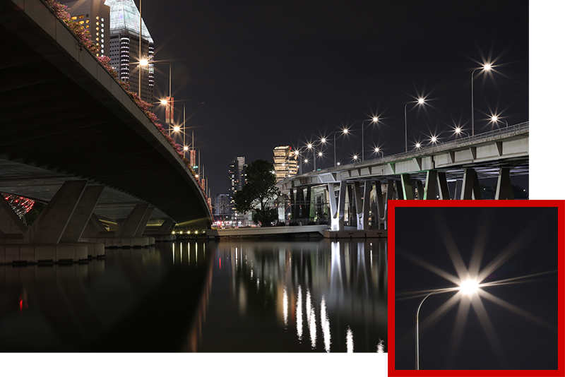 Smudges on the lens have blurred the starburst points of the street lights in front. If you want nice starbursts, it’s always good to have a lens cloth, lens cleaning liquid and blower on hand. Also notice how the shape of the lights have affected the shape of the starburst.