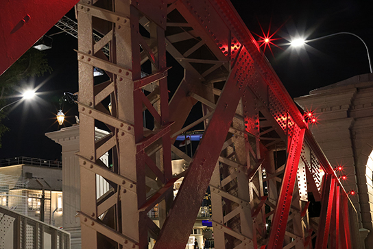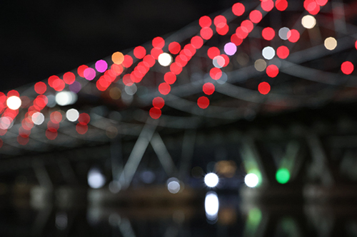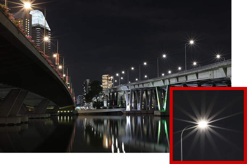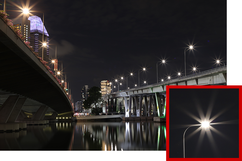 In this image, three different types of light sources produced starbursts: the street lamps, the tiny red lights on the bridge, and if you look really closely, the vintage-looking second light from the left. Which source do you think gives the nicest starburst? What makes it different?