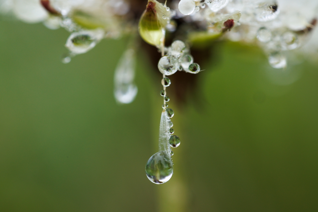 Tiny droplets of water created by the rain. Shot at over life-size magnification, they look like elaborate beads of jewels.