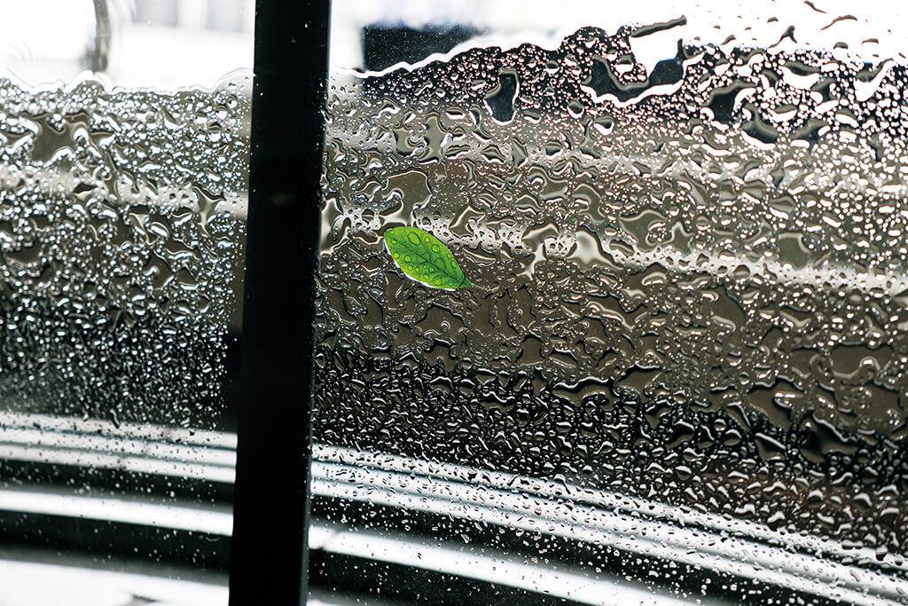 A leaf on the glass roof on a rainy day, shot from directly below. The lens has helped to capture the texture of the raindrops on glass in crisp yet natural-looking detail. The clarity of the rendering makes even mundane scenes like this look impressive.