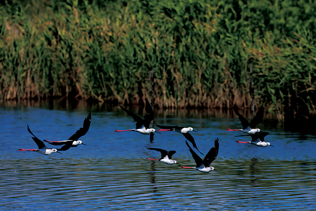You usually need a focal length of at least 500mm to photograph wild birds, but when capturing a flock of them in flight, like the black-winged stilts in this shot, it is easier to get a balanced composition using a zoom lens compared to a prime lens.