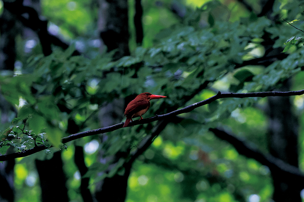 This ruddy kingfisher doesn’t quite stand out in the dark forest. I didn’t have time to attach an extender, so I used the 1.6x crop function on the EOS R5. This took the red bird out of its unintended “camouflage” and made it pop against the green.
