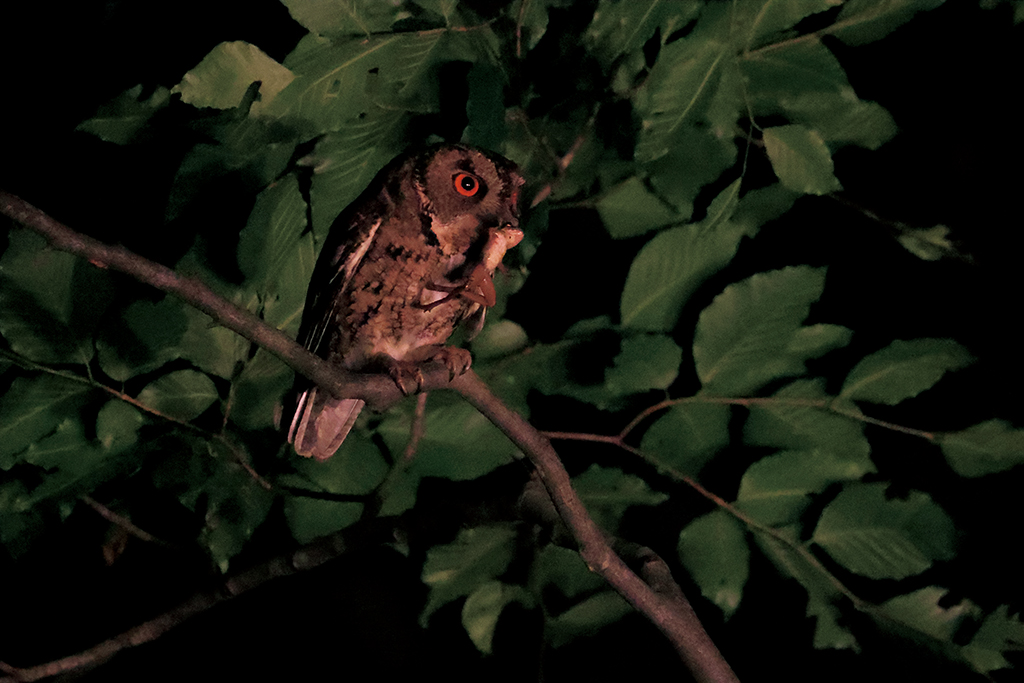 A collared scops owl with supper in its beak. I used the Extender RF 1.4x, but decided I wanted a closer shot and used the 1.6x crop mode too. The resulting 1,120mm equivalent angle of view captured the owl’s prey clearly, creating more impact. Even at ISO 32,000, the image quality is decent, reflecting the excellent high ISO speed performance of the EOS R5.