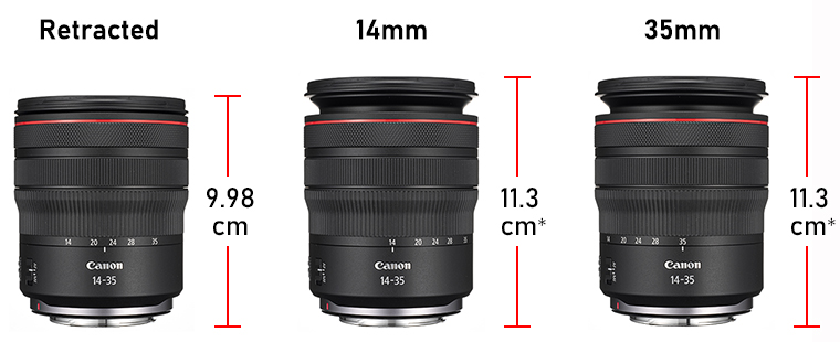 Canon’s f/4L zoom lenses are built for portability, and this was aided by the large diameter and short back focus distance of the RF mount. The RF14-35mm f/4L IS USM is around 13mm shorter and 75g lighter than the EF16-35mm f/4L IS USM. As the image above shows, when the lens is extended for shooting, the change in length is minimal.