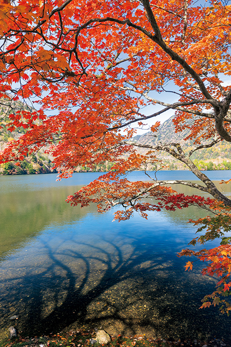 The vibrant autumn leaves by the lakeside and the shadow of the bare tree below it make an interesting juxtaposition. These two subjects were far apart, but shooting vertically at 24mm, I managed to capture them both in a well-balanced composition.