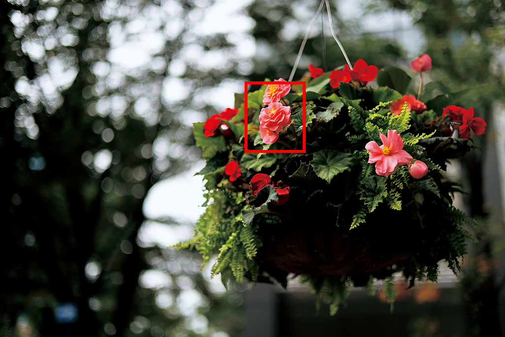 The area in the red frame, cropped in. This is where I placed the focus. The area around the flowers has a smooth, gradual blur. The lens beautifully reproduces not just the dimensionality of the scene but also the soft texture of the petals.