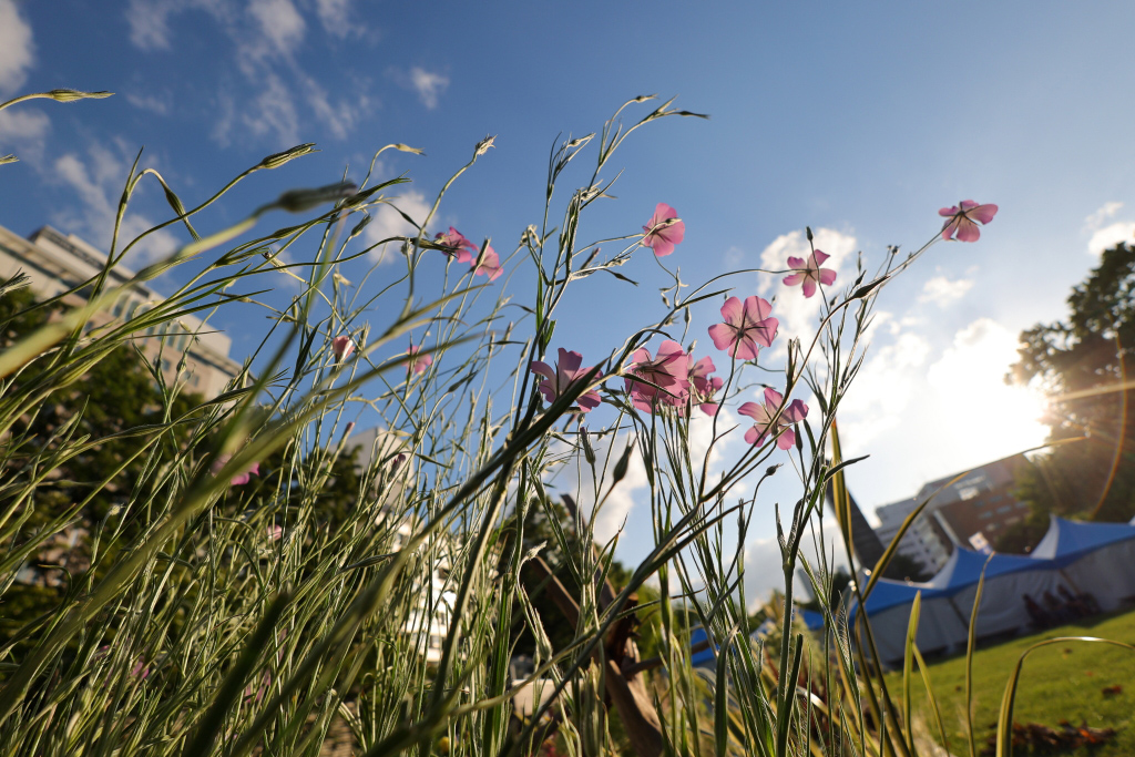 This was shot looking up from the base of the flowers. The small size of the lens made it easy to manoeuvre into tight shooting spots like this one. In the strong backlight, there is some visible ghosting and flaring but very little reduction in contrast.