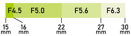 As the RF15-30mm f/4.5-6.3 IS STM is a variable aperture zoom lens, the maximum aperture changes with the focal length. Here is what I observed.