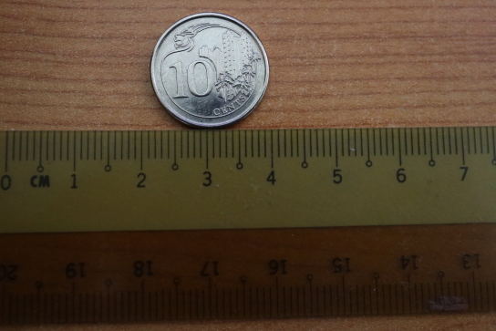 The magnification ratio in this image is the length of the sensor (36mm) divided by the actual size of the subject (76mm), i.e., approx. 0.47x. The coin has therefore been magnified 0.47x, close to the 0.5x maximum magnification of the lens.