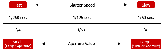The chart above shows the relationship between the aperture value and the shutter speed. For example, the same amount of brightness can be obtained in a photo either by opening up the aperture to increase the shutter speed or by stopping down the aperture to slow down the shutter speed.