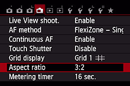 Press the MENU button on the rear body to access the "Aspect Ratio" item in the Live View menu. During Live View shooting, the image will be displayed on the LCD monitor screen in the selected aspect ratio.