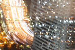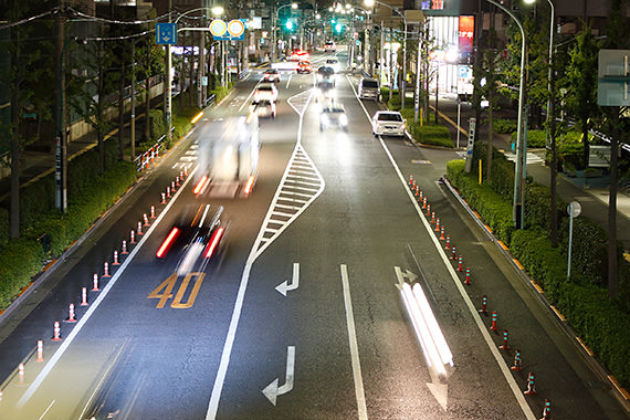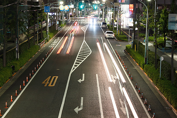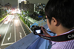 Choose a timing when there is traffic flow, and aim your camera from an overhead bridge. Here, I disabled the camera flash, and took this shot with the shutter speed set to 1/2 second. Although motion blur is observed in cars that are travelling at a fast speed, this shutter speed setting is not slow enough to create light streaks in the vehicles that passed by.