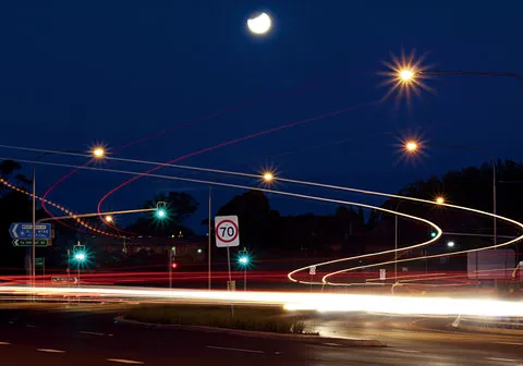 In this example, I chose a low ISO speed. This, together with the use of a narrower aperture, enabled me to achieve a slower shutter speed. A slow shutter speed blurs the light from the headlight and taillight of the cars, forming light trails.