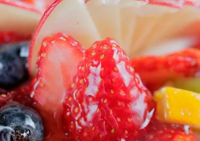 Light was shining on the strawberry when I focused on it, making it look lustrous. However, while the apple slices and other toppings in the background were captured with intense colour, the finishing became flat and looked slightly dark.