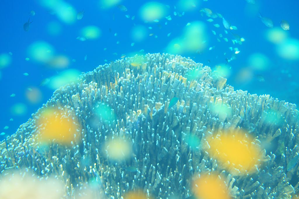 For the shot above, which features a school of blue pearl-spot chromis on top of the table coral, I set the aperture to f/5. I selected a subject in a bright location where there was sufficient sunlight and then framed the shot with the blue ocean as the backdrop while shooting the subject at eye level. I used a low intensity flash because I wanted to create changes in the gradation of the blue colour. Although the blue pearl-spot chromis is the main subject, I focused on the coral at the back in order to create a layer of dots by blurring the fish in front.