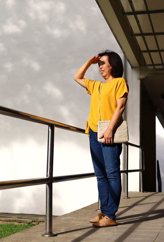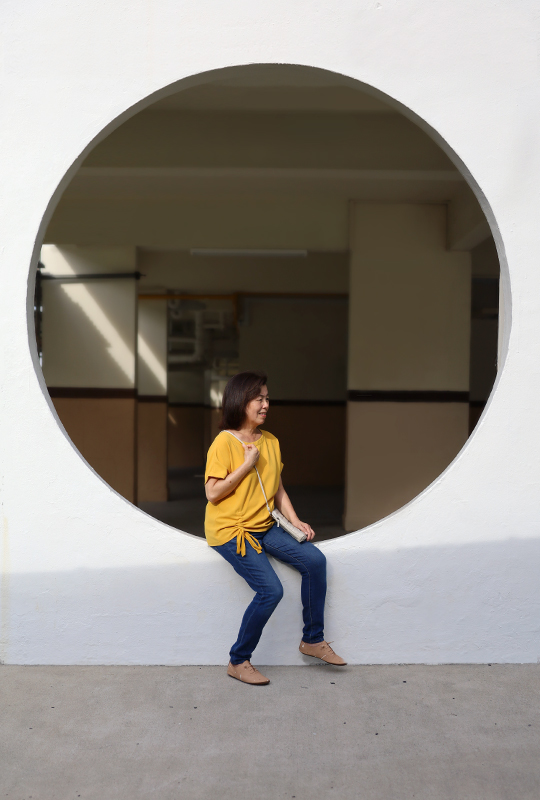 Observe the different shapes in your surroundings and use them as a creative background for your OOTD shoot. In this case, place your model at the edge of the circle in a relaxed pose to show off her jeans. In here, we create a shape (the circle) and an angle (the legs), which makes the photo more interesting to look at.