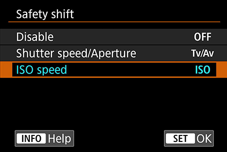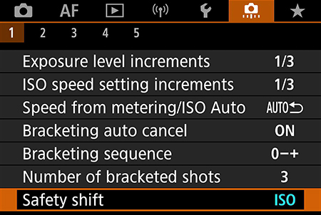 The Safety Shift function is located in the orange menu of more advanced cameras.