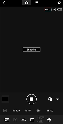 Tap the shutter release button in the Remote Live View shooting function in Canon Camera Connect to start the exposure. The Live View display will turn black and display “Shooting”. The timer in the top right corner (in red) shows how much time has elapsed. If you are using the bulb timer function, the exposure will end after the configured time. If not, simply tap the stop button to end the exposure.