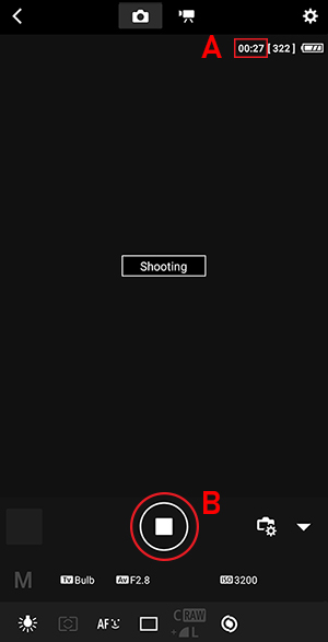 The display will change to show “Shooting”, and the time elapsed will be shown in ‘A’. If you are using the bulb timer function, the exposure will automatically end after the set duration. If not, press the stop button (‘B’) to end the exposure.